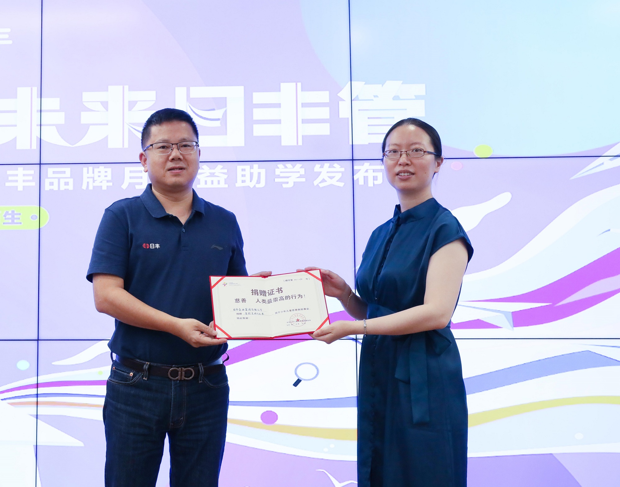 發(fā)布會(huì)現(xiàn)場,中華少年兒童慈善救助基金會(huì)代表葛書然更為日豐頒發(fā)了捐贈(zèng)證書。